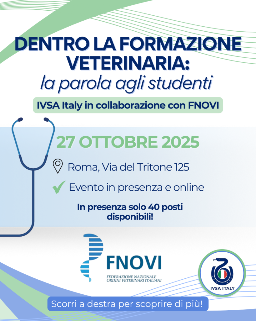 Il 27 ottobre 2025, dalle 14.30 alle 16.30, IVSA Italy sarà presente presso la sede FNOVI, in Via del Tritone n. 125 – Roma, per un incontro dedicato alla presentazione e discussione dei risultati dei questionari somministrati agli studenti di Medicina Veterinaria nel biennio 2024–2025.