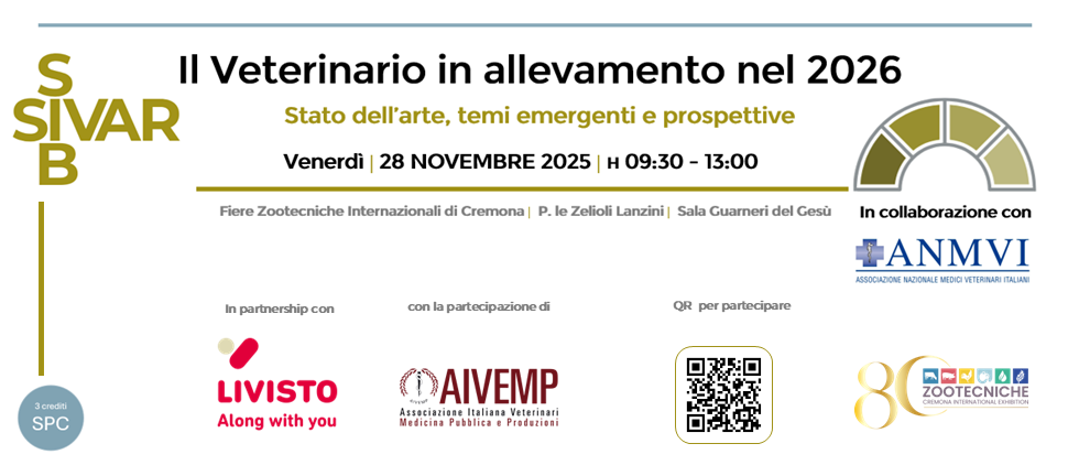 SivarSib – Società Italiana Veterinari Animali da Reddito/Società Italiana di Buiatria organizza il Seminario Nazionale dal titolo “Il Veterinario in allevamento nel 2026. Analisi e confronto sullo stato dell’arte e sulle prospettive emergenti” in occasione della Rassegna Internazionale Bovino da Latte presso CremonaFiere Spa a Cremona in data Giovedì 28 novembre 2025.
