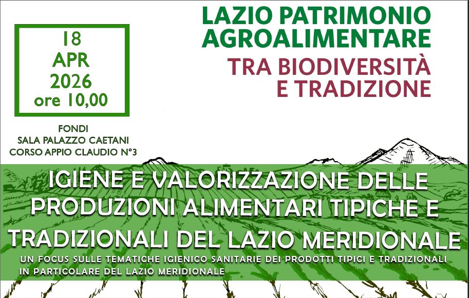 In data 18 aprile 2026 presso la Sala convegni di Palazzo Caetani in Corso Appio Claudio n. 3 a FONDI (LT) si terrà il convegno dal titolo “Igiene e valorizzazione delle produzioni alimentari tipiche e tradizionali del Lazio Meridionale” organizzato in collaborazione con AIVI, Parco Naturale Regionale dei Monti Ausoni e Lago di Fondi e con il patrocinio dell’ Ordine dei Medici Veterinari della provincia di Latina e l’ IZS Lazio e Toscana “M. Alenadri”.
